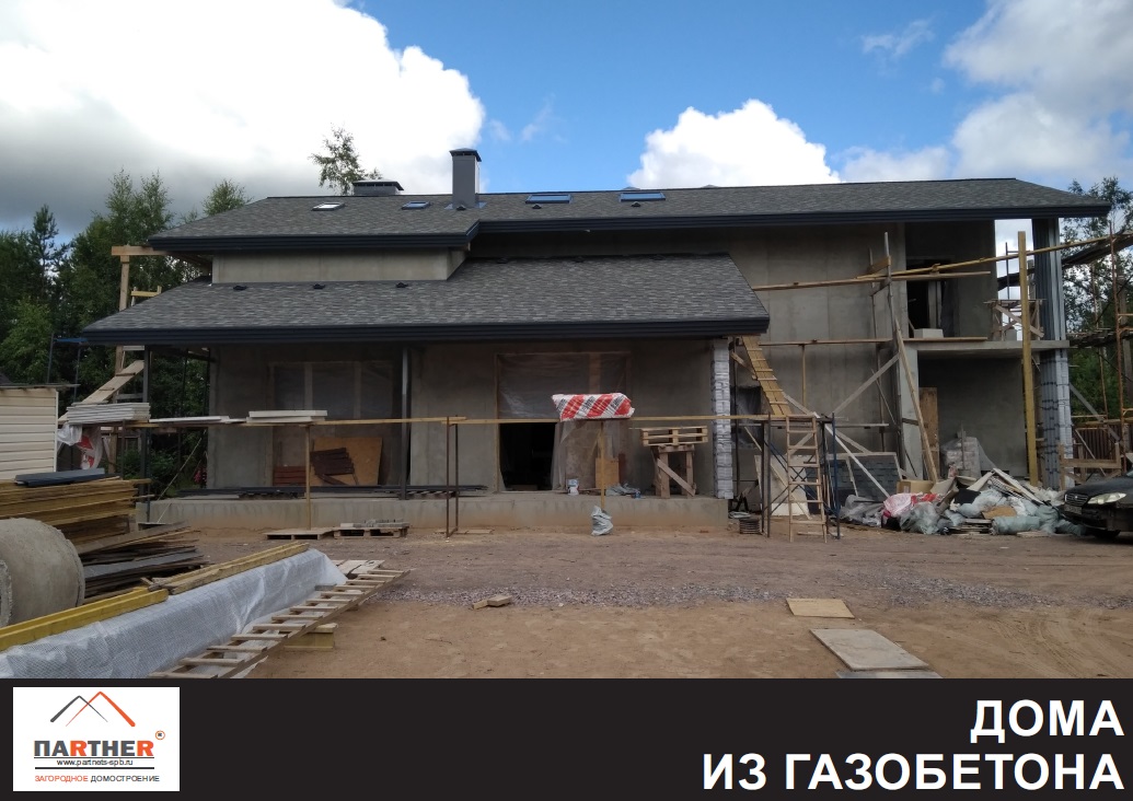 Технологические особенности газобетона дают возможность архитекторам и будущим хозяевам домов реализовать самые смелые фантазии и задумки. Но при всех своих достоинствах у газобетона есть один существенный недостаток. И связан он как раз с технологией его изготовления. А именно: газобетонные блоки лекго впитываю воду из окружающей среды (дождь, пар, туман). Поэтому даже во время строительства, стены из газобетона необходимо укрывать сверху пленкой, дабы избежать попадания осадков. А после возвденния стен ("коробки") дома, необходимо как можно скорее возвести кровлю и приступить к отделке наружных стен декоративным защитным материалом.
